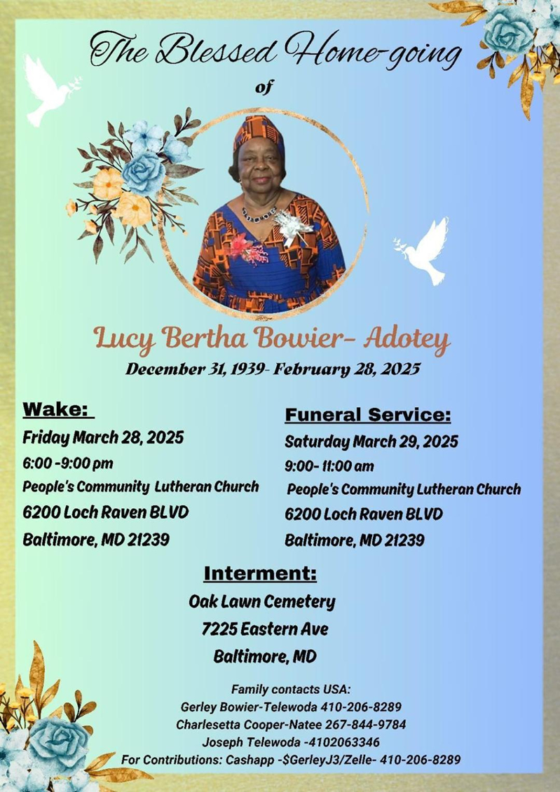 With thanksgiving to God for a life well lived, we announce the death of our Matriarch in her 85th year, Lucy Bertha Bowier-Adotey. She transitioned on February 28, 2025, at her home in Baltimore, Maryland, USA.